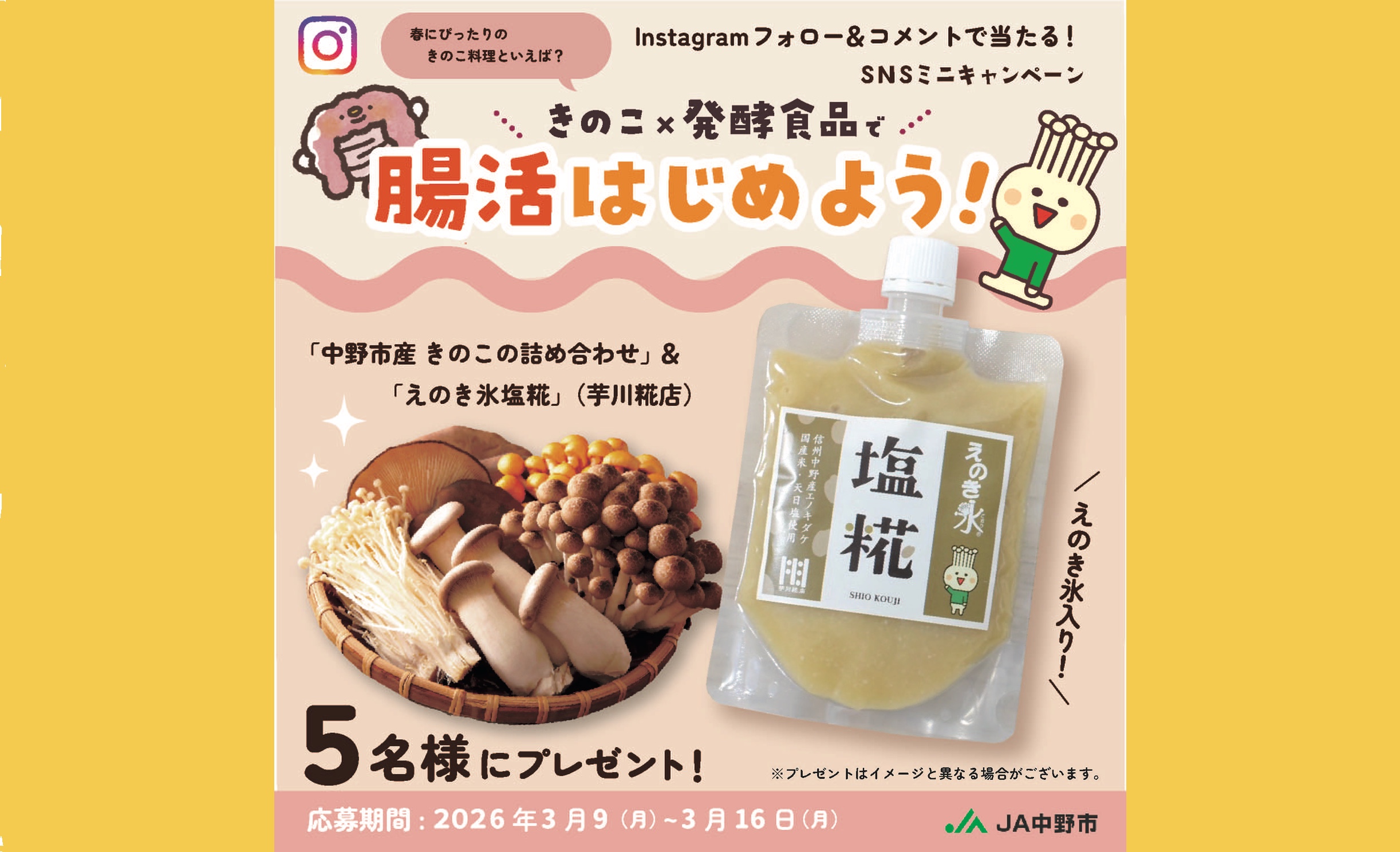 ニュース [毎月開催]インスタフォロー&コメント投稿で当てよう!「きのこ×発酵食品で腸活はじめよう」ミニキャンペーン 2026年3月9日 レシピ特集 【本日更新YouTube】5分で完成!レンチン時短「えのきのキムチ和え」 2026年3月6日 きのこコラム [3月8日はサバの日]きのこ×サバで栄養満点!美容にも◎ 2026年3月5日 きのこコラム [Tiktokきのこのつまみ食い!ちゃちゃっと菌ツマ] 巻いて!挟んで!包んで!最強オツマミ4品 2026年2月27日 レシピ特集 きのこで腸活&免疫力アップ!花粉対策きのこレシピ3選 2026年2月25日 レシピ特集 【本日更新YouTube】きのこでかさ増し!家計応援「きのこ麻婆豆腐」 2026年2月20日