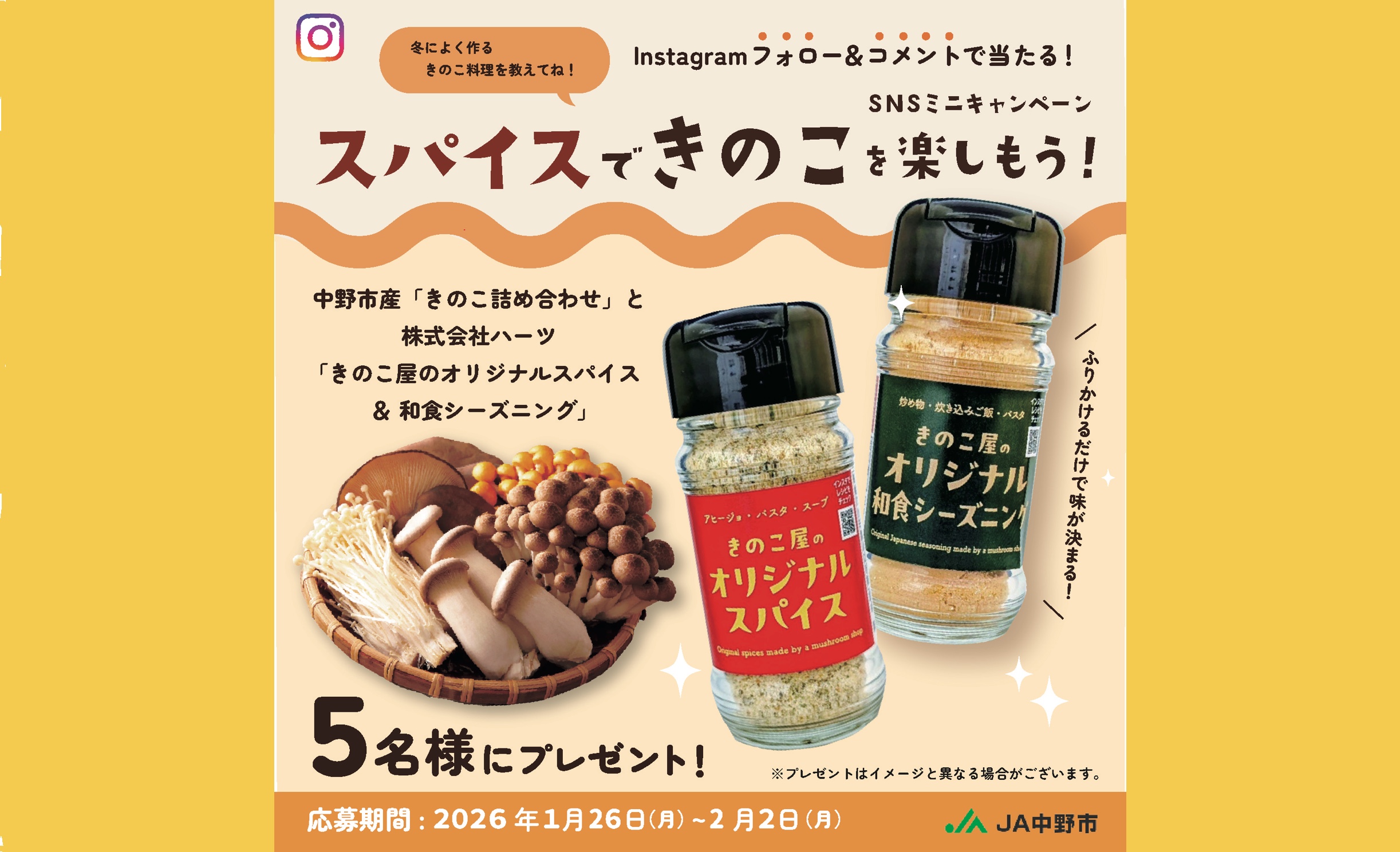 ニュース [毎月開催]インスタフォロー&コメント投稿で当てよう!「スパイスできのこを楽しもう」ミニキャンペーン 2026年1月26日 レシピ特集 【本日更新YouTube】きのこだけで作れるシリーズ「ヤンニョムエリンギ」 2026年1月23日 きのこコラム [TikTok きのこのツマミ食い!ちゃちゃっと菌ツマ!]鍋以外でも大活躍!えのきたけで作る簡単ツマミ3選 2026年1月20日 レシピ特集 [からだポカポカ]冬こそ食べたい!生姜×きのこレシピ3選 2026年1月14日 レシピ特集 【本日更新YouTube】お手軽副菜!きのこ小鉢「えのきの炒り豆腐」 2026年1月9日 レシピ特集 [お餅レシピ]きのこで余ったお餅をおいしくアレンジ 2026年1月5日