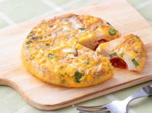 きのこや野菜が入ったボリューム満点のオムレツです。エネルギーを燃やすために必要なたんぱく質を含む卵や、脂質や糖質の分解に関わるナイアシンを含むトマトやコーン、デトックス効果の高いきのこを組み合わせました。