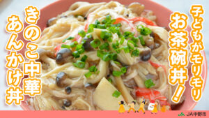 香ばしく炒めた3種のきのこのうま味と中華風味がぴったり。あんかけのとろみがごはんに絡むので、お子さんでも食べやすいです。